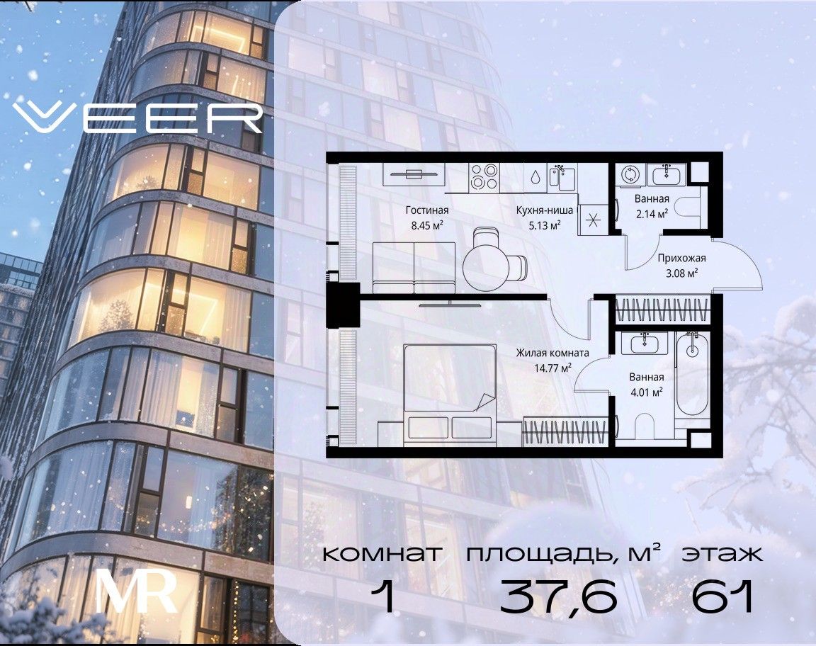 Продаётся 1-комнатная квартира общей площадью 37.58 м² без отделки в ЖК VEER на 61-м этаже 70 этажного дома.