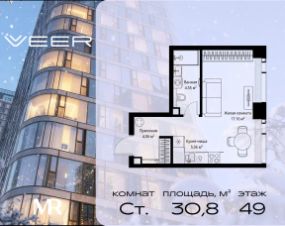 Продаётся студия общей площадью 30.83 м² без отделки в ЖК VEER на 49-м этаже 70 этажного дома.