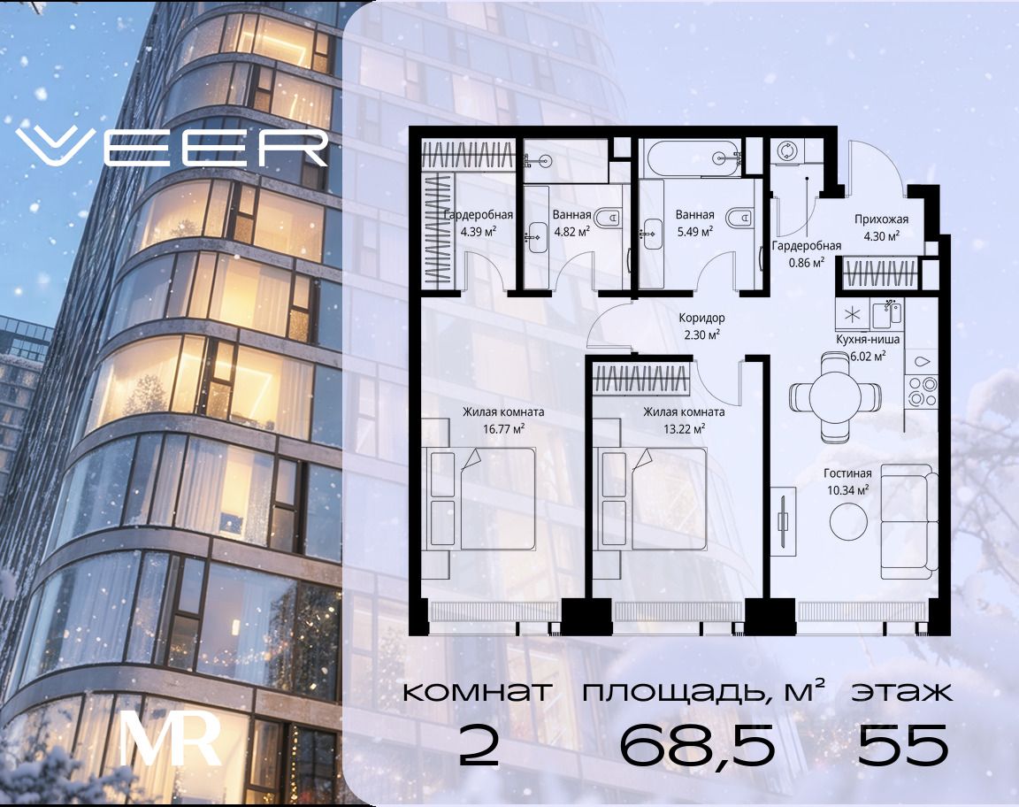 Продаётся 2-комнатная квартира общей площадью 68.51 м² без отделки в ЖК VEER на 55-м этаже 70 этажного дома.