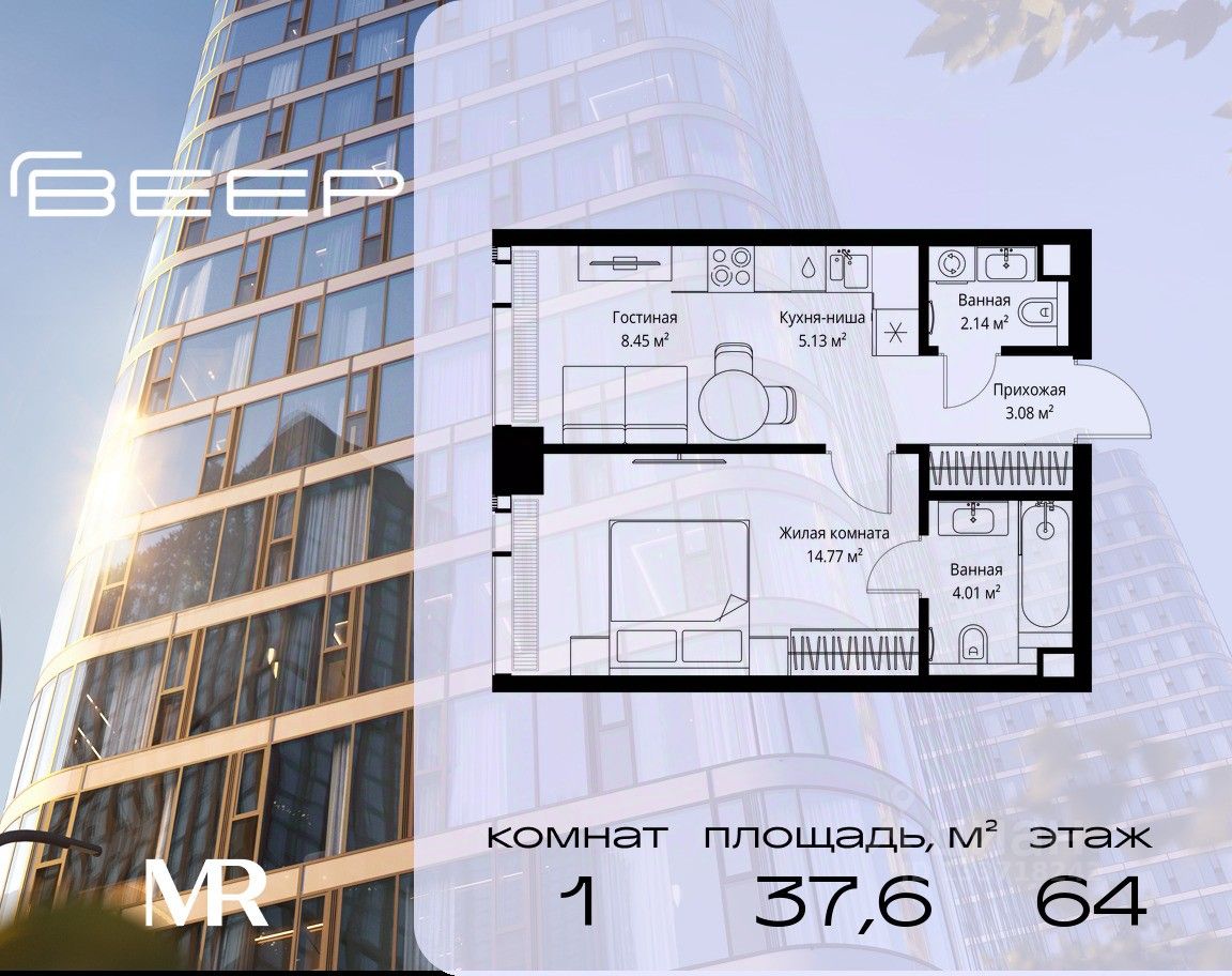 Продаётся 1-комнатная квартира общей площадью 37.58 м² без отделки в ЖК Веер на 64-м этаже 70 этажного дома.