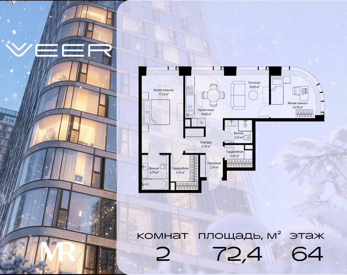 Продаётся 2-комнатная квартира общей площадью 72.42 м² без отделки в ЖК VEER на 64-м этаже 70 этажного дома.