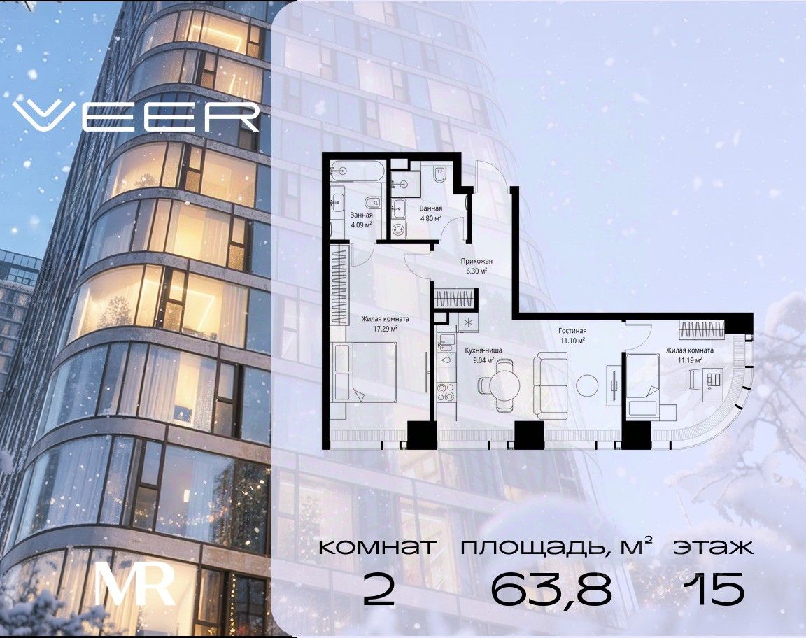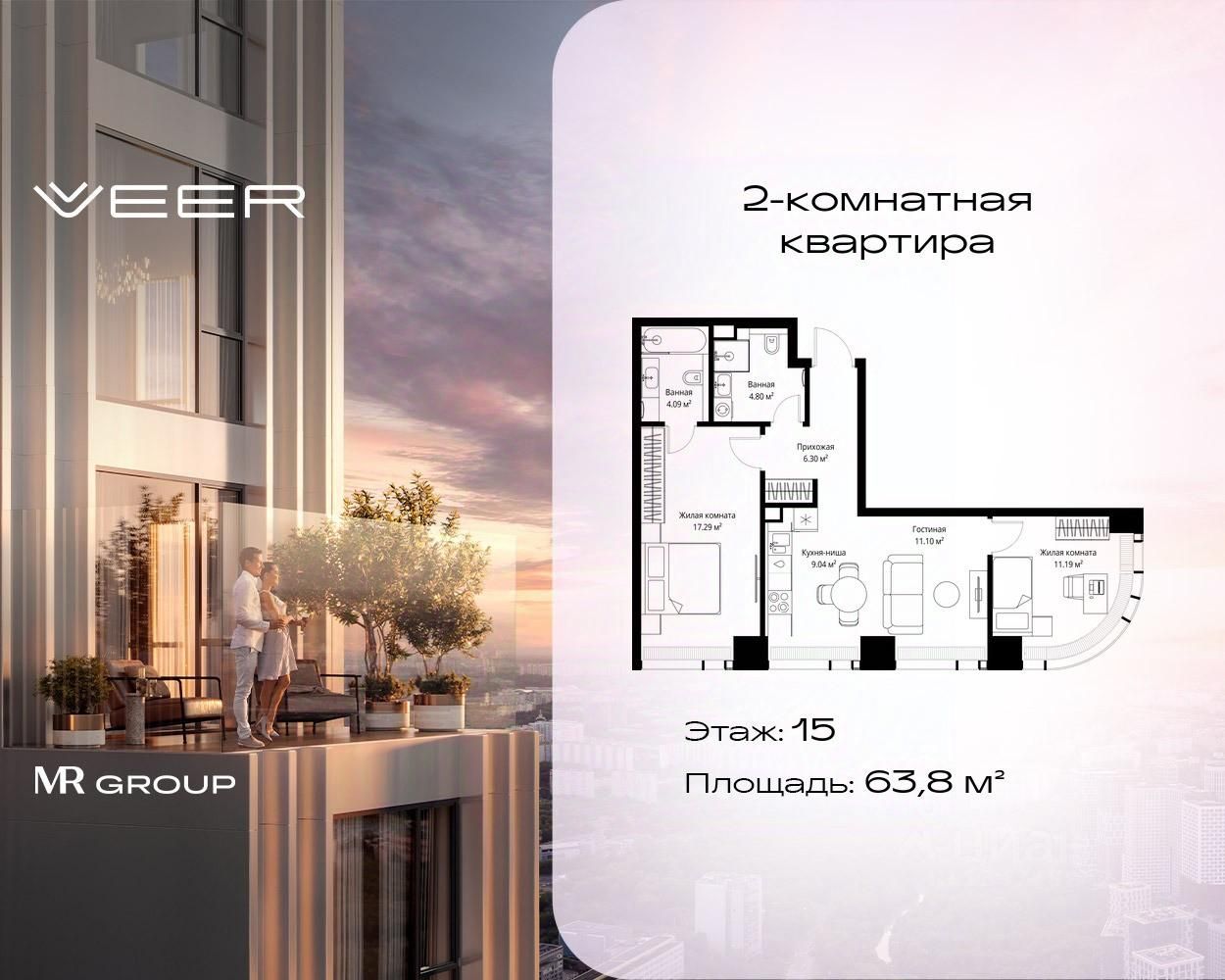 Продаётся 2-комнатная квартира общей площадью 63.81 м² без отделки в ЖК VEER на 15-м этаже 70 этажного дома.