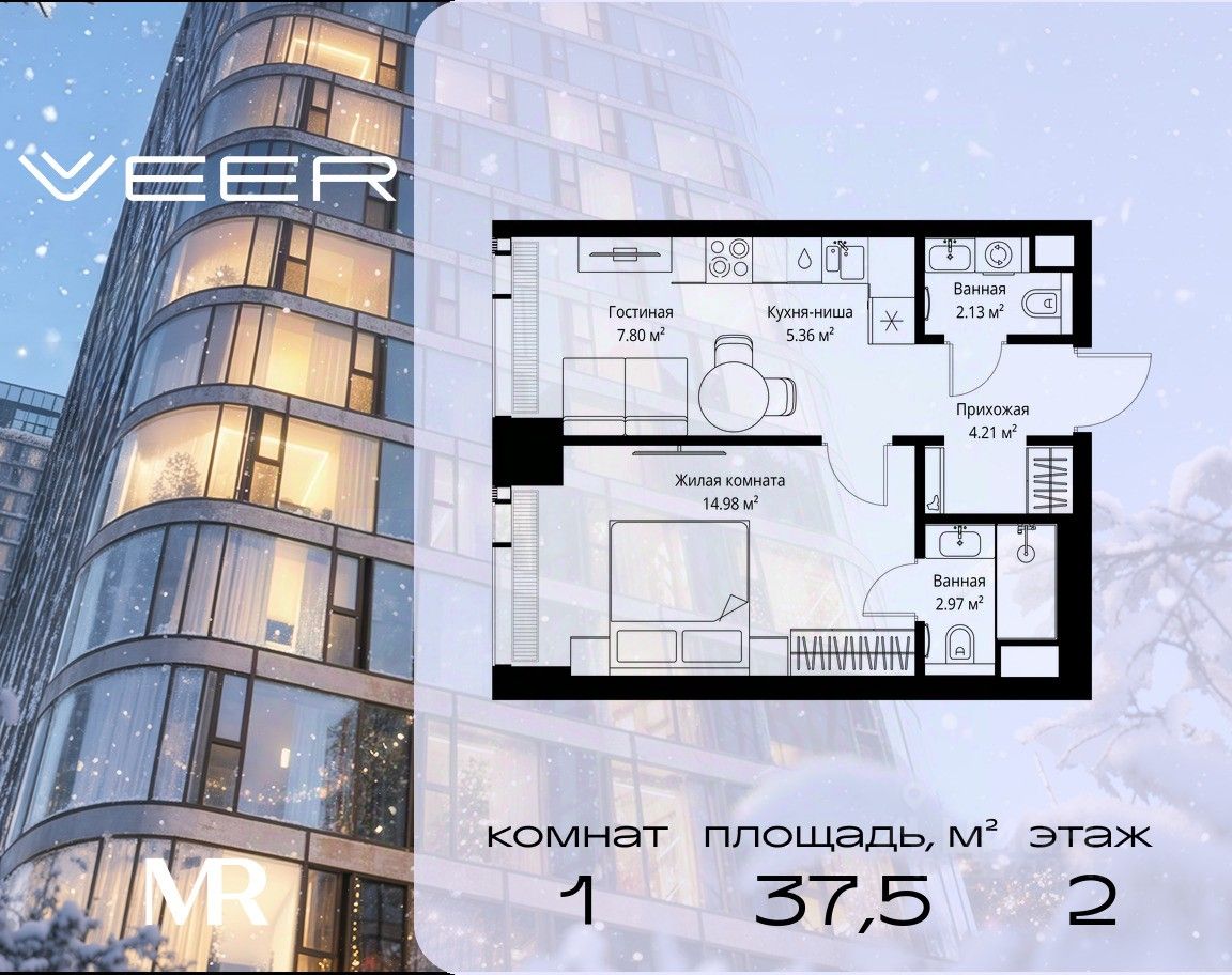 Продаётся 1-комнатная квартира общей площадью 37.45 м² без отделки в ЖК VEER на 2-м этаже 70 этажного дома.