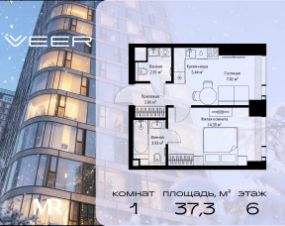 Продаётся 1-комнатная квартира общей площадью 37.25 м² без отделки в ЖК VEER на 6-м этаже 70 этажного дома.