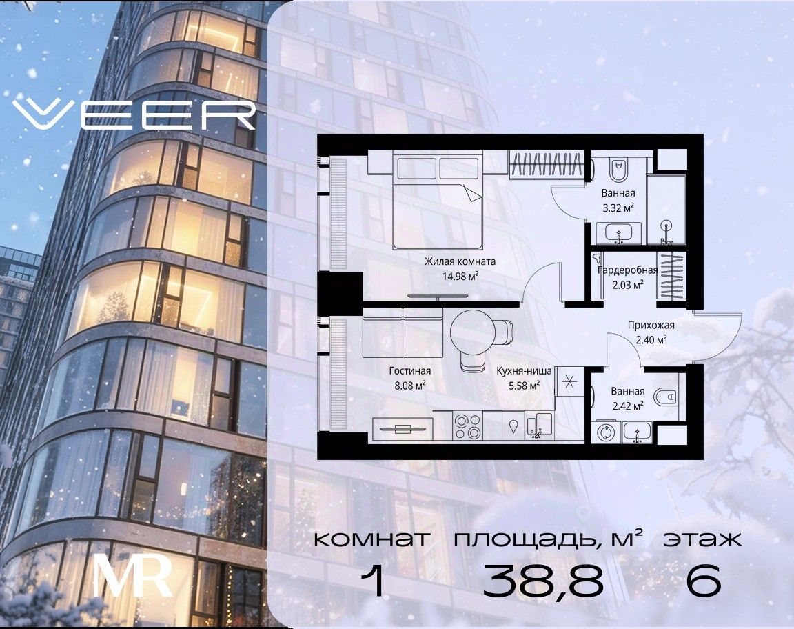 Продаётся 1-комнатная квартира общей площадью 38.81 м² без отделки в ЖК VEER на 6-м этаже 70 этажного дома.