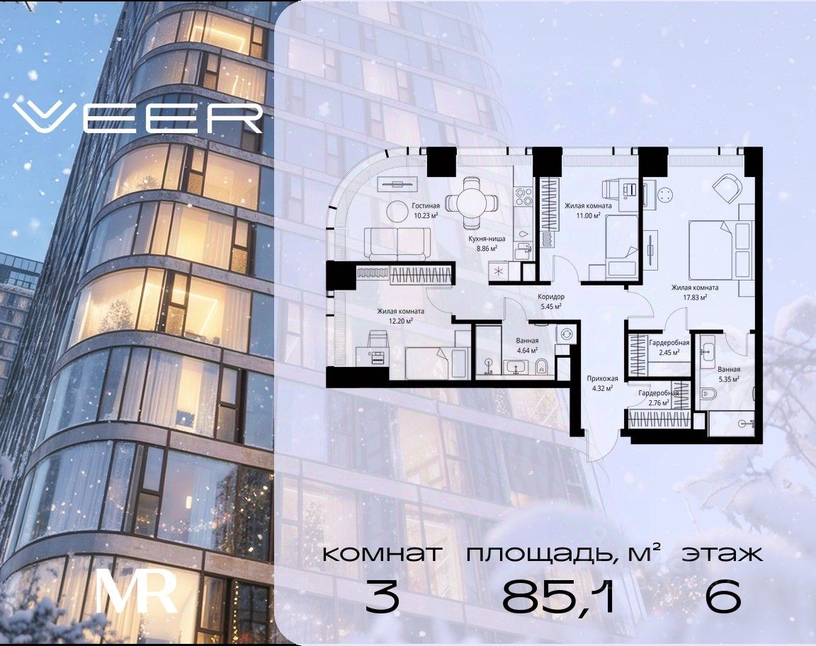 Продаётся 3-комнатная квартира общей площадью 85.09 м² без отделки в ЖК VEER на 6-м этаже 70 этажного дома.