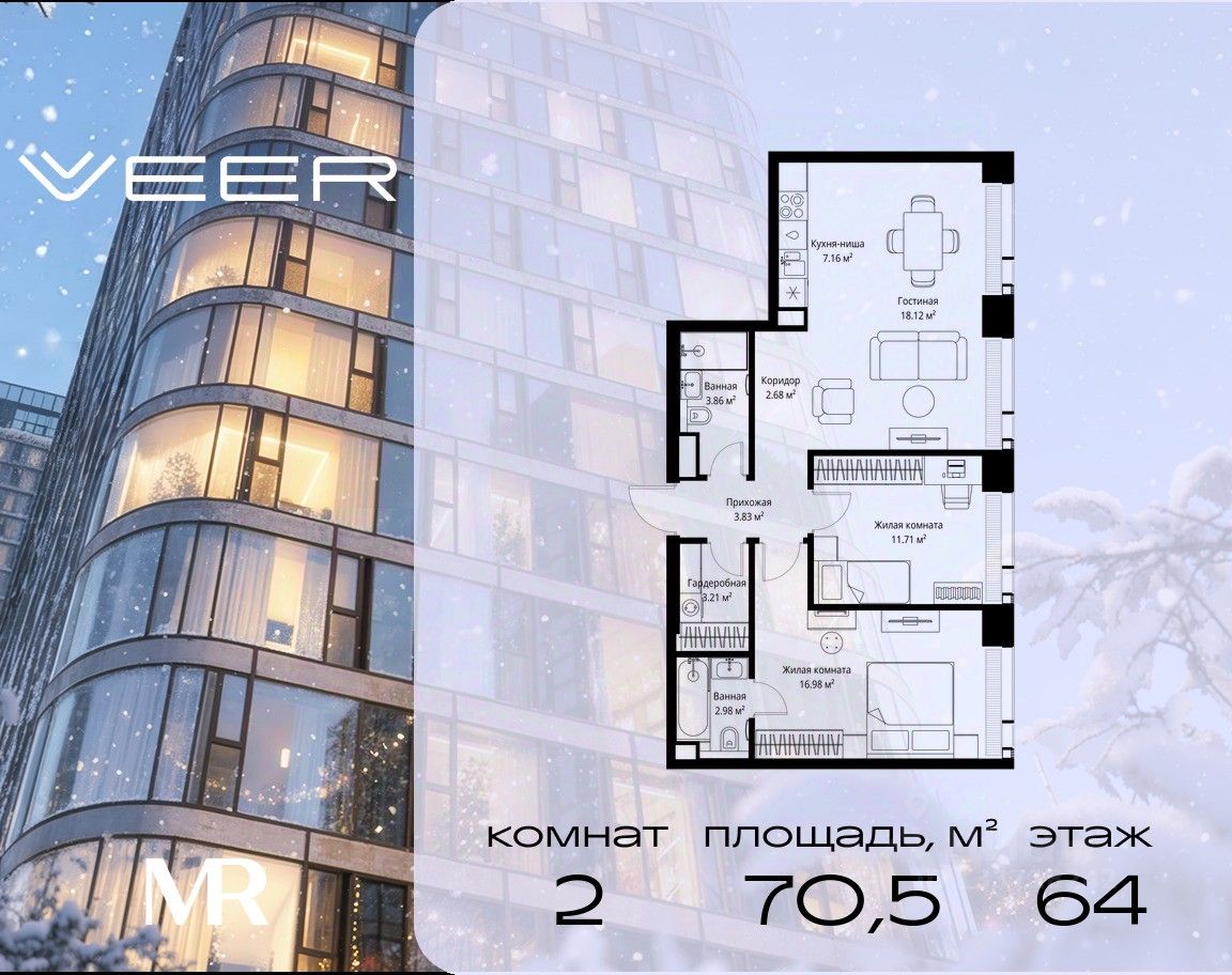 Продаётся 2-комнатная квартира общей площадью 70.53 м² без отделки в ЖК VEER на 64-м этаже 70 этажного дома.