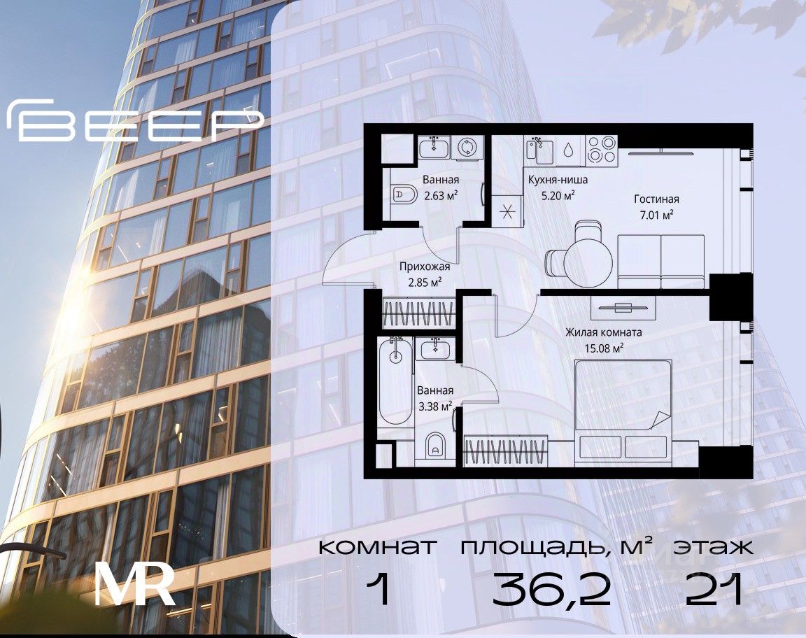 Продаётся 1-комнатная квартира общей площадью 36.15 м² без отделки в ЖК Веер на 21-м этаже 70 этажного дома.