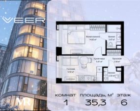Продаётся 1-комнатная квартира общей площадью 35.30 м² без отделки в ЖК VEER на 6-м этаже 35 этажного дома.