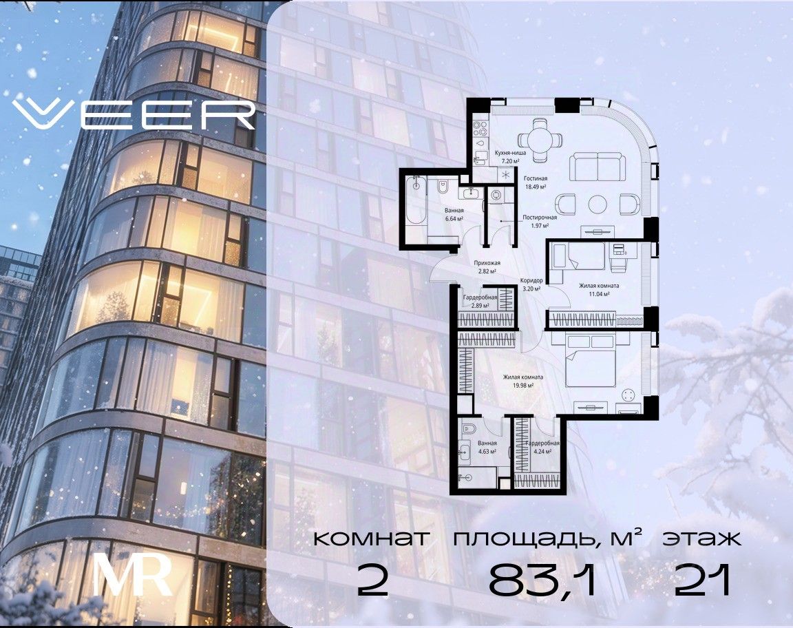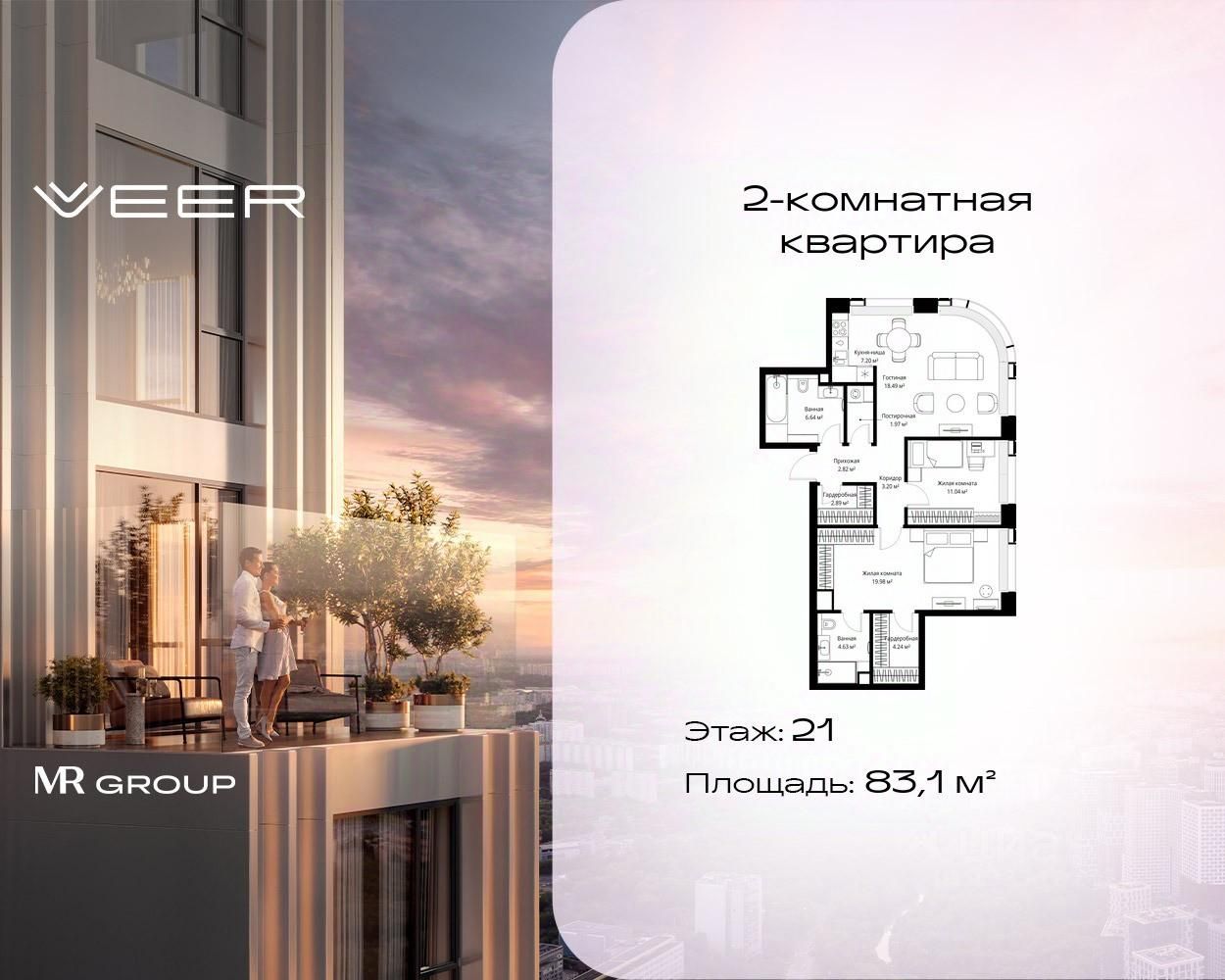 Продаётся 2-комнатная квартира общей площадью 83.10 м² без отделки в ЖК VEER на 21-м этаже 35 этажного дома.