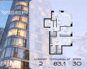Продаётся 2-комнатная квартира общей площадью 83.11 м² без отделки в ЖК VEER на 30-м этаже 35 этажного дома.