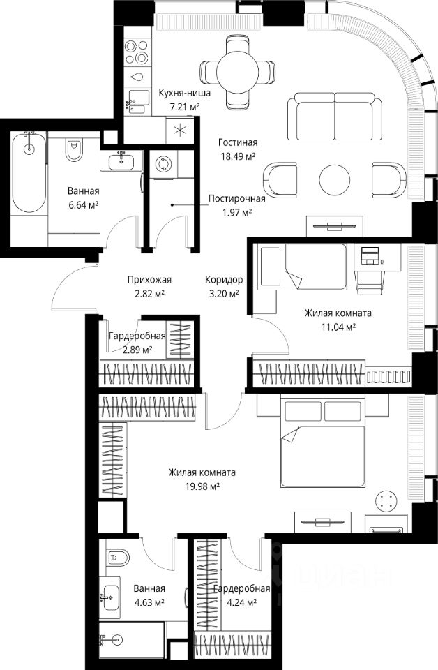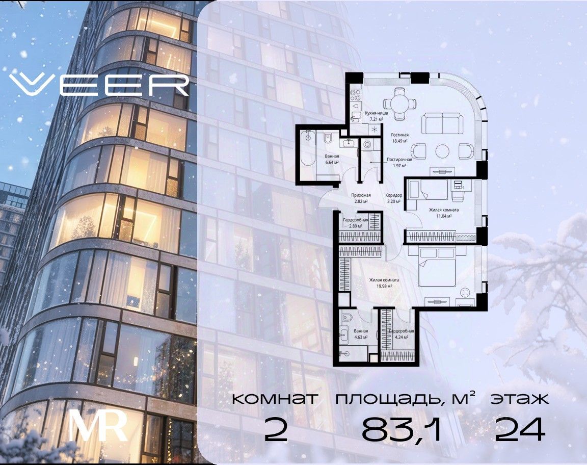 Продаётся 2-комнатная квартира общей площадью 83.11 м² без отделки в ЖК VEER на 24-м этаже 35 этажного дома.