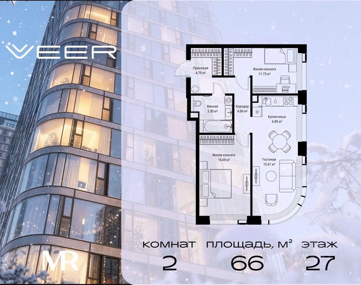Продаётся 2-комнатная квартира общей площадью 65.97 м² без отделки в ЖК VEER на 27-м этаже 35 этажного дома.