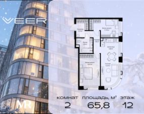 Продаётся 2-комнатная квартира общей площадью 65.80 м² без отделки в ЖК VEER на 12-м этаже 35 этажного дома.