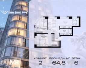 Продаётся 2-комнатная квартира общей площадью 64.81 м² без отделки в ЖК VEER на 6-м этаже 35 этажного дома.
