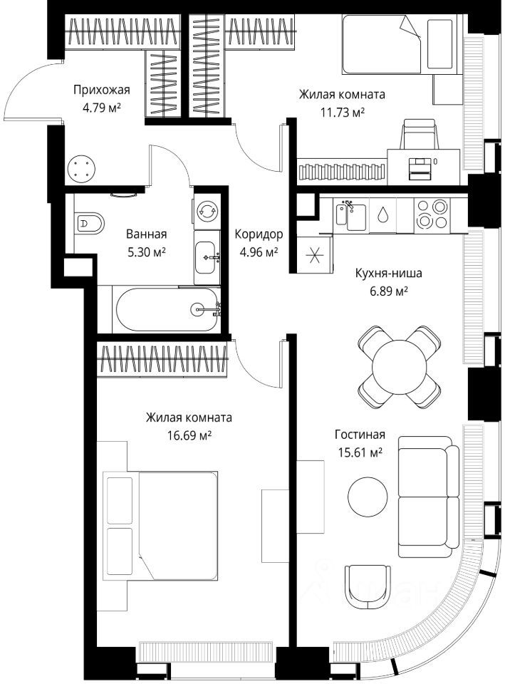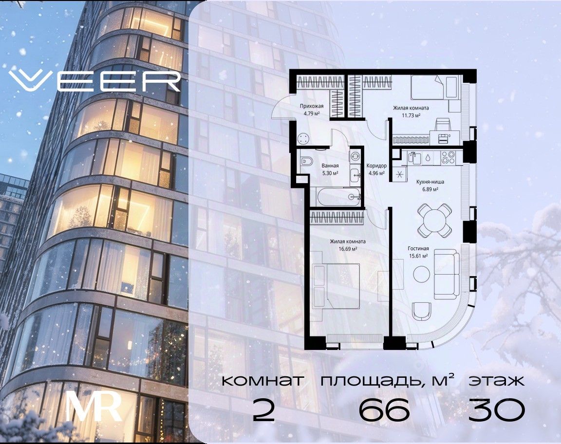 Продаётся 2-комнатная квартира общей площадью 65.97 м² без отделки в ЖК VEER на 30-м этаже 35 этажного дома.