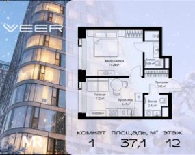 Продаётся 1-комнатная квартира общей площадью 37.10 м² без отделки в ЖК VEER на 12-м этаже 35 этажного дома.