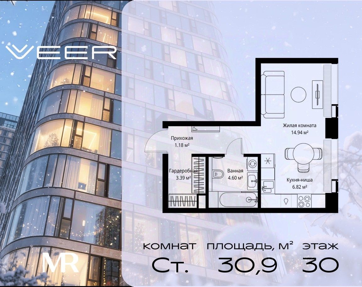 Продаётся студия общей площадью 30.93 м² без отделки в ЖК VEER на 30-м этаже 35 этажного дома.