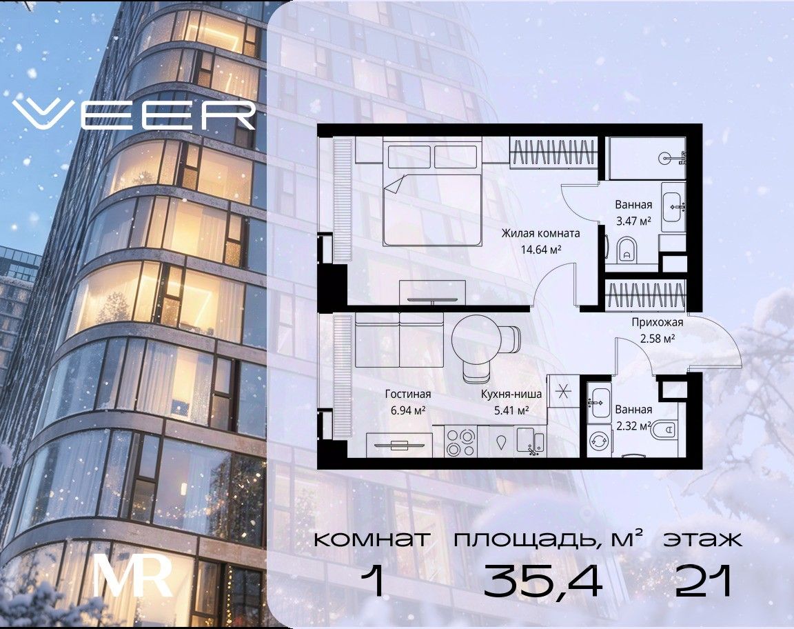 Продаётся 1-комнатная квартира общей площадью 35.36 м² без отделки в ЖК Веер на 21-м этаже 35 этажного дома.