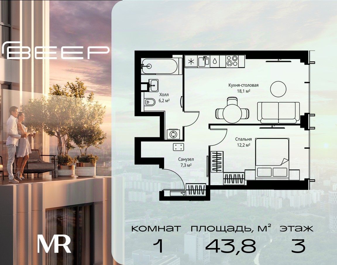 Продаётся 1-комнатная квартира общей площадью 43.80 м² без отделки в ЖК Веер на 3-м этаже 59 этажного дома.