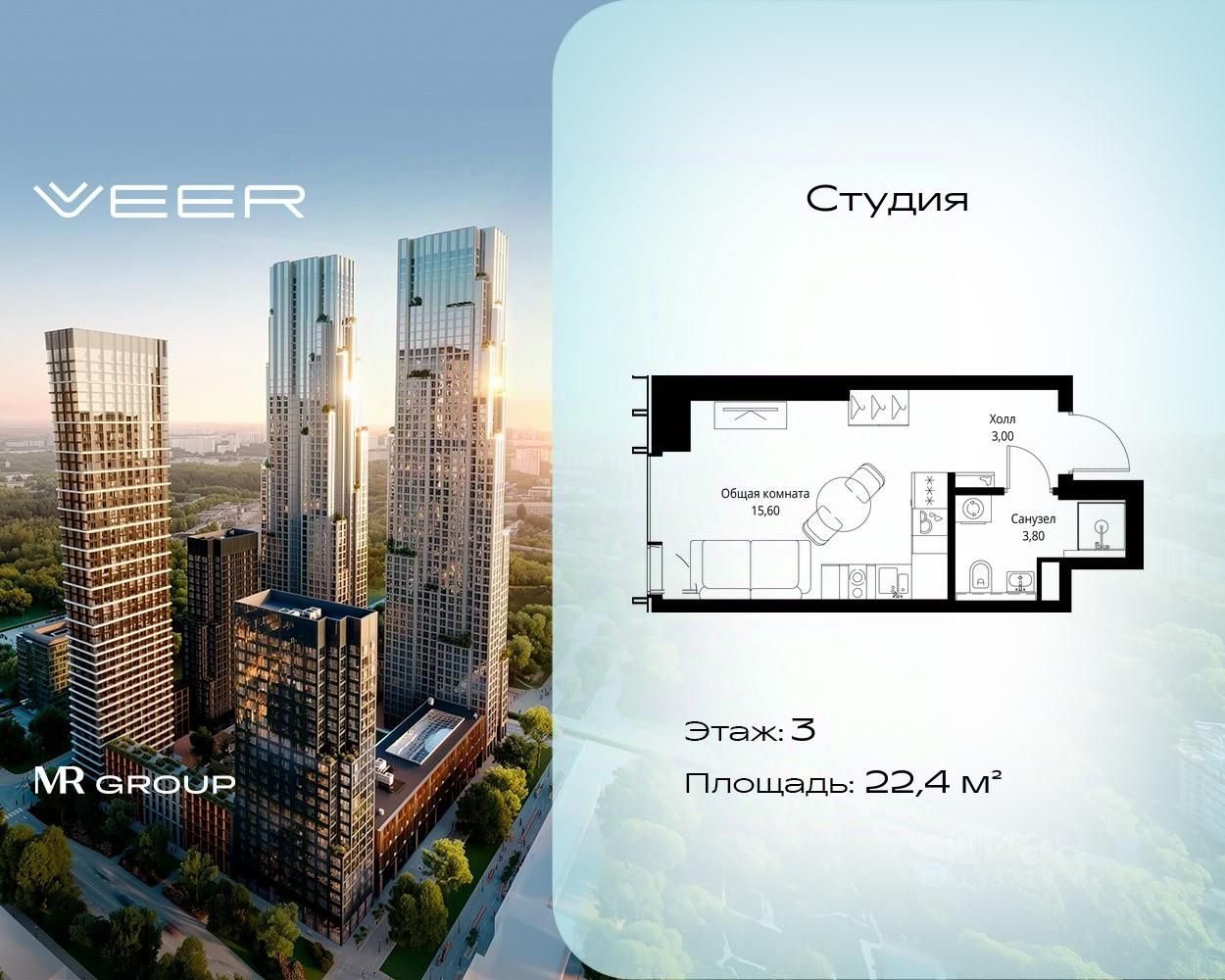 Продаётся студия общей площадью 22.40 м² без отделки в ЖК VEER на 3-м этаже 59 этажного дома.