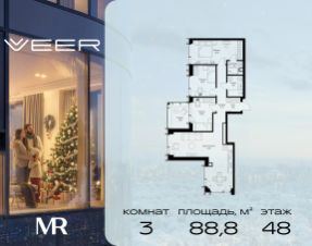 Продаётся 3-комнатная квартира общей площадью 88.80 м² без отделки в ЖК VEER на 48-м этаже 59 этажного дома.