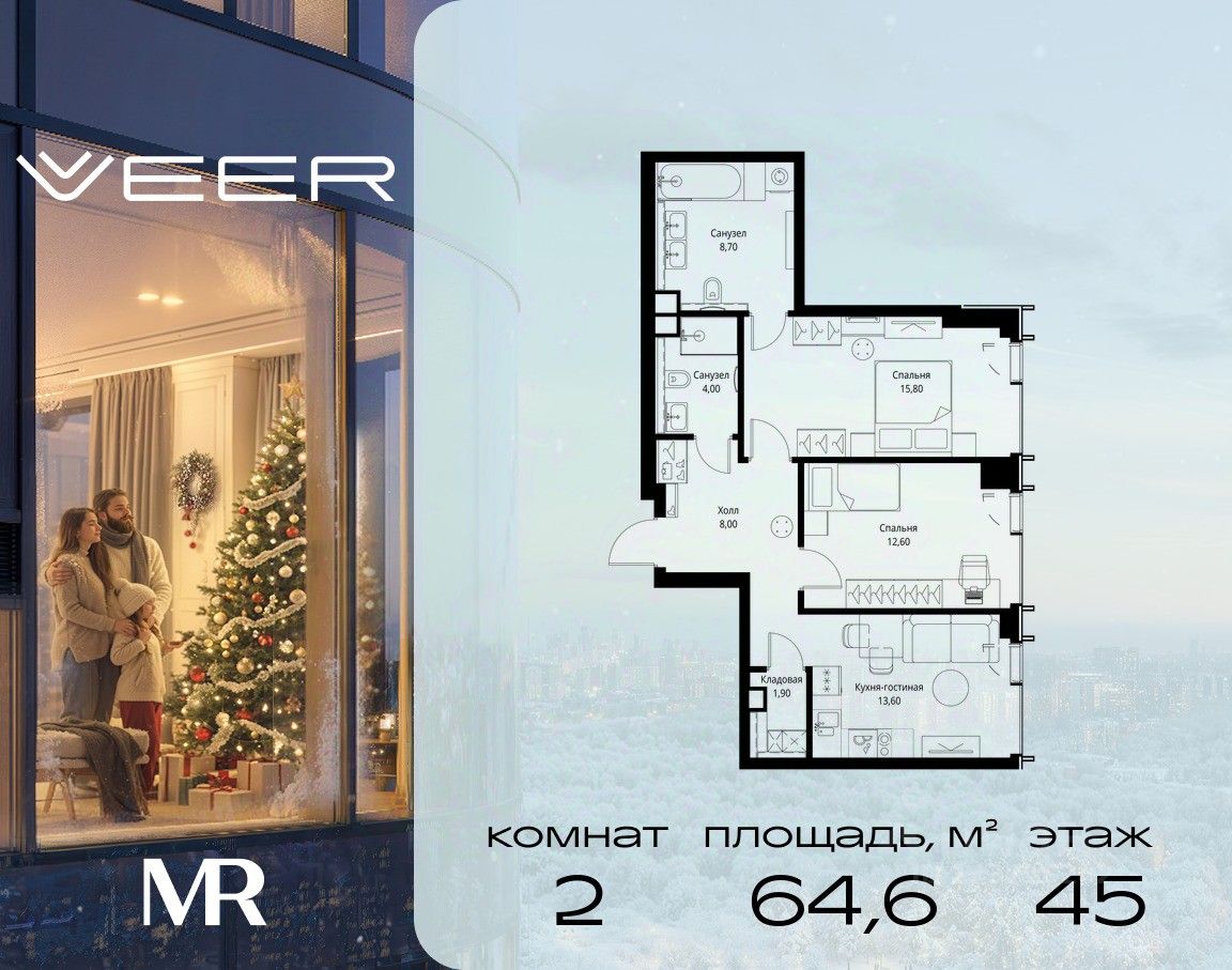 Продаётся 2-комнатная квартира общей площадью 64.60 м² без отделки в ЖК VEER на 45-м этаже 59 этажного дома.