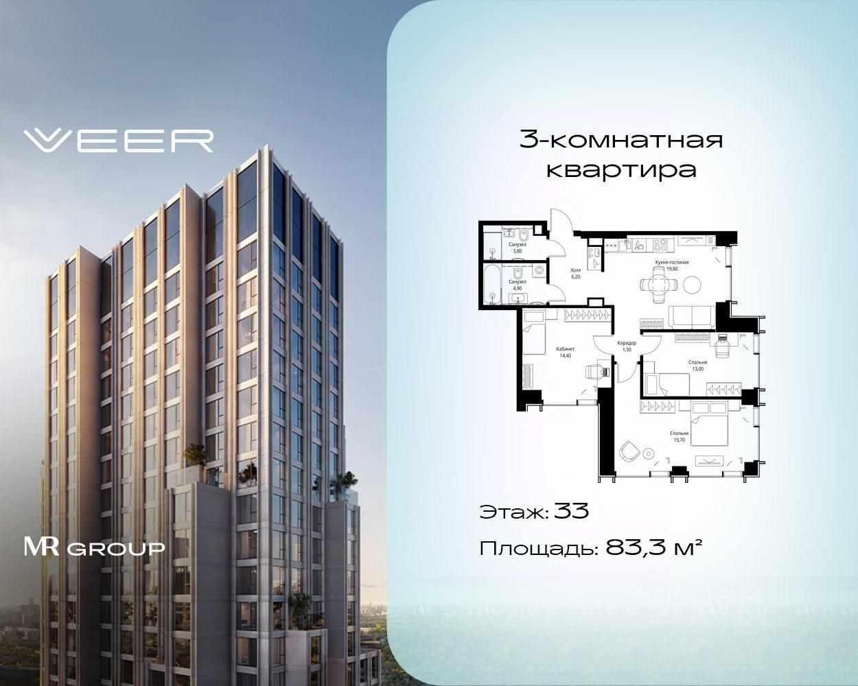 Продаётся 3-комнатная квартира общей площадью 83.30 м² без отделки в ЖК VEER на 33-м этаже 59 этажного дома.