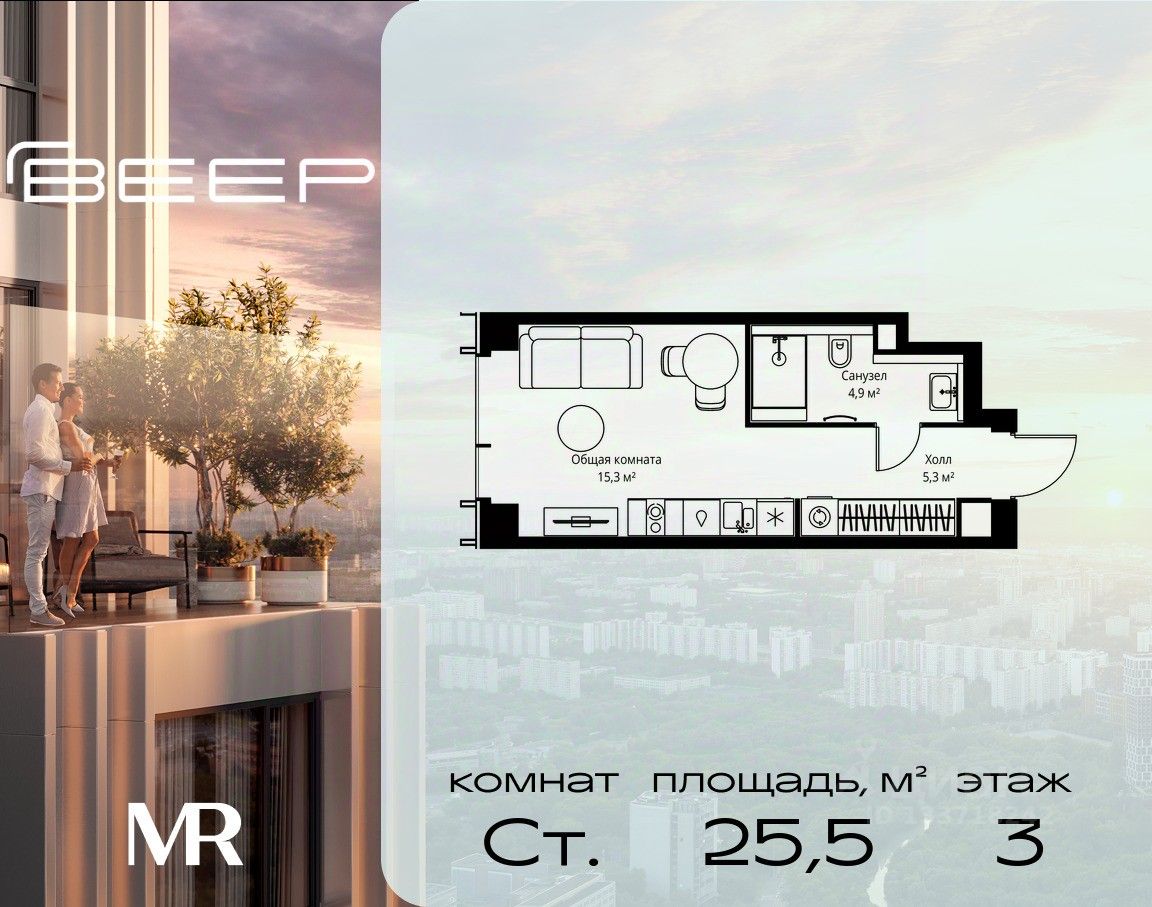 Продаётся студия общей площадью 25.50 м² без отделки в ЖК Веер на 3-м этаже 59 этажного дома.