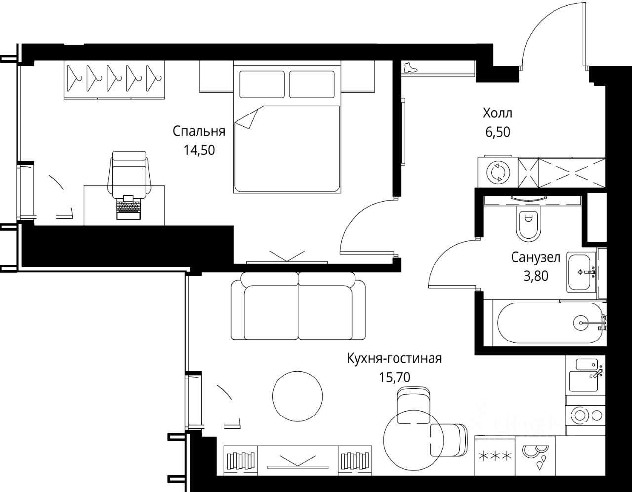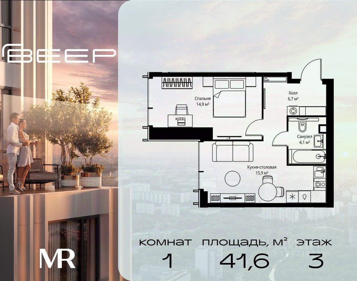 Продаётся 1-комнатная квартира общей площадью 41.60 м² без отделки в ЖК Веер на 3-м этаже 59 этажного дома.