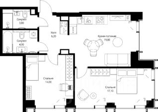 Продаётся 2-комнатная квартира общей площадью 65.80 м² без отделки в ЖК VEER на 42-м этаже 59 этажного дома.
