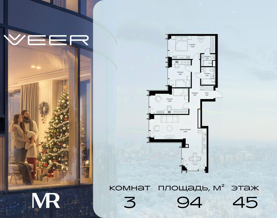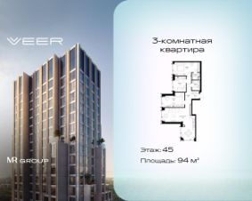 Продаётся 3-комнатная квартира общей площадью 94 м² без отделки в ЖК VEER на 45-м этаже 59 этажного дома.