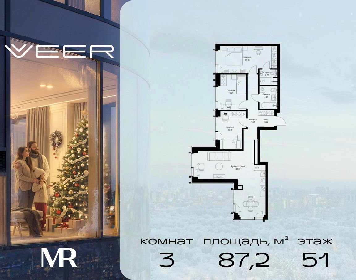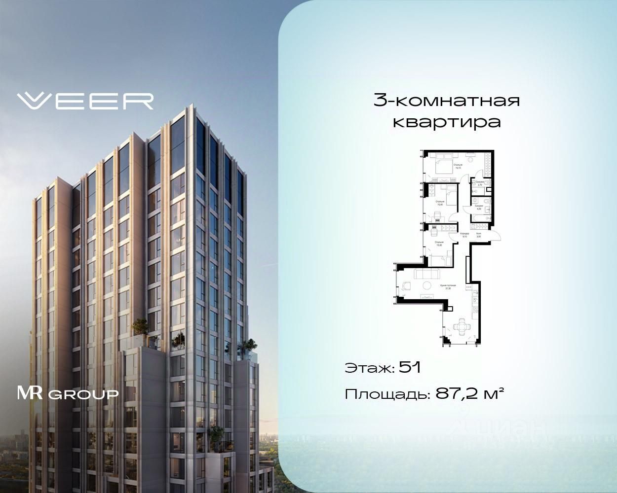 Продаётся 3-комнатная квартира общей площадью 87.20 м² без отделки в ЖК VEER на 51-м этаже 59 этажного дома.