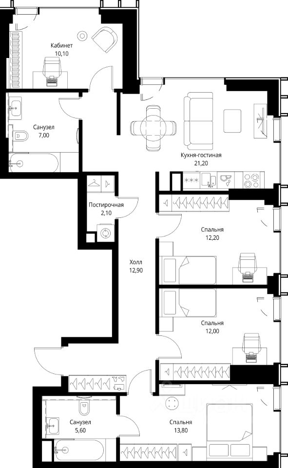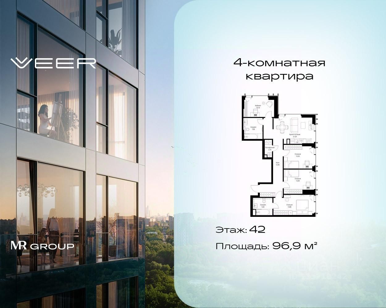 Продаётся 4-комнатная квартира общей площадью 96.90 м² без отделки в ЖК VEER на 42-м этаже 59 этажного дома.