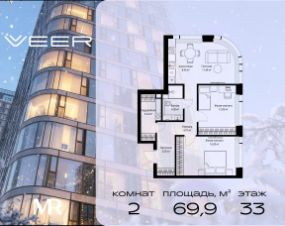 Продаётся 2-комнатная квартира общей площадью 69.90 м² без отделки в ЖК VEER на 33-м этаже 38 этажного дома.
