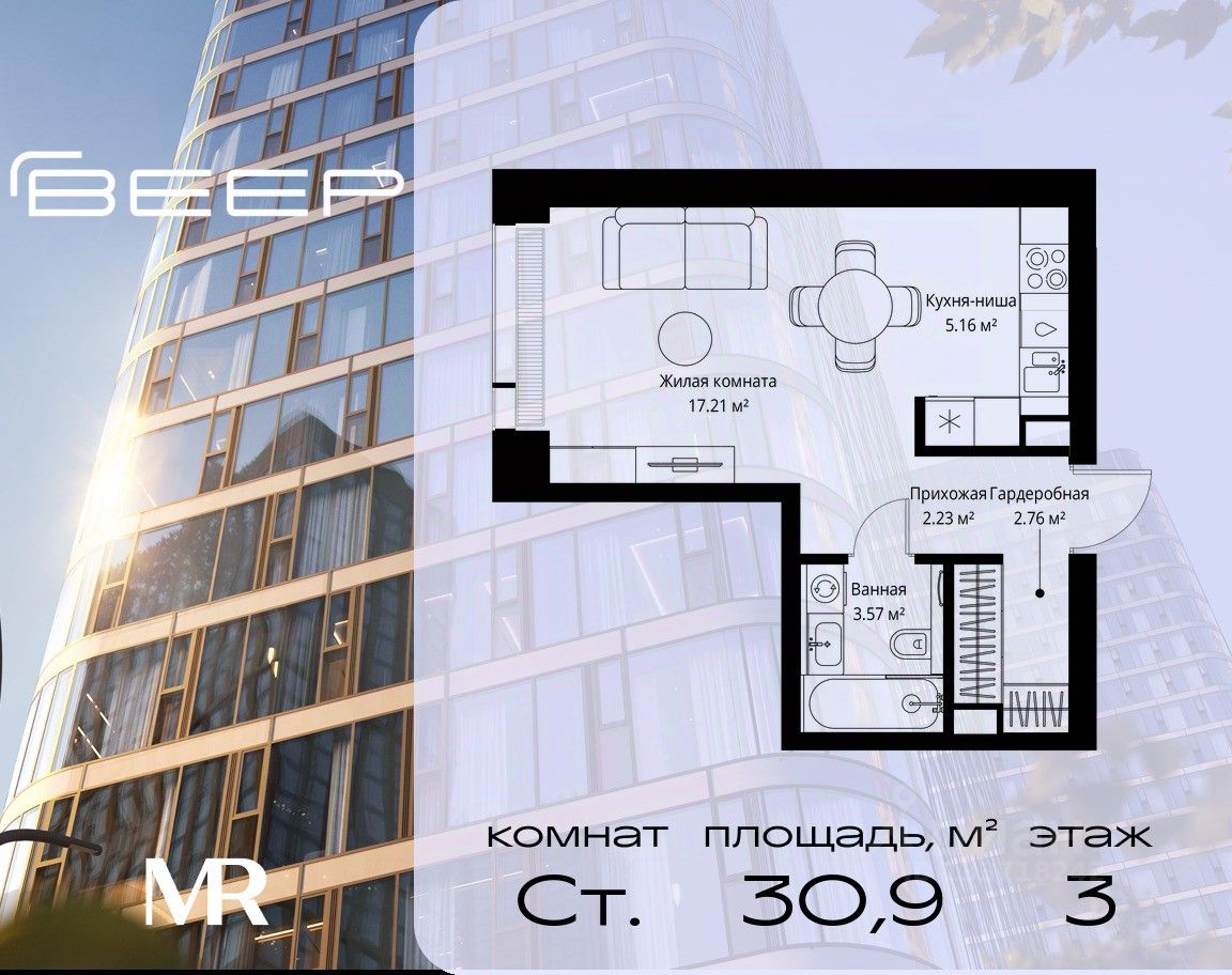 Продаётся студия общей площадью 30.93 м² без отделки в ЖК Веер на 3-м этаже 38 этажного дома.