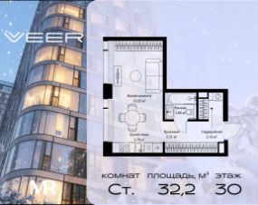 Продаётся студия общей площадью 32.21 м² без отделки в ЖК VEER на 30-м этаже 38 этажного дома.