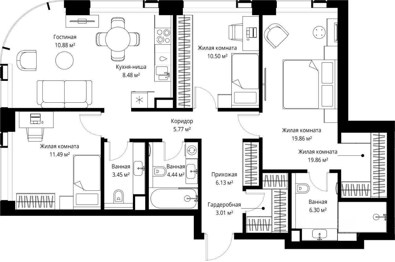Продаётся 3-комнатная квартира общей площадью 90.31 м² без отделки в ЖК VEER на 36-м этаже 38 этажного дома.