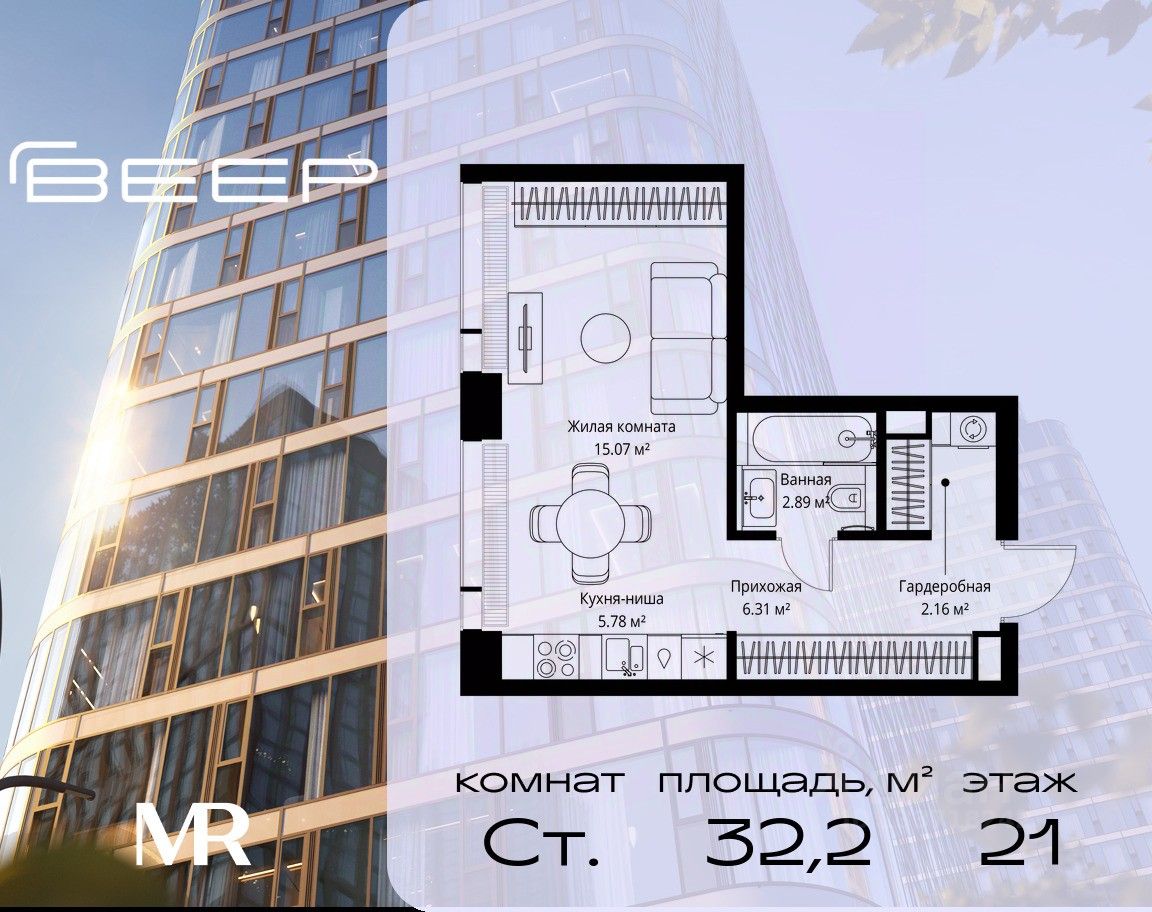 Продаётся студия общей площадью 32.21 м² без отделки в ЖК Веер на 21-м этаже 38 этажного дома.