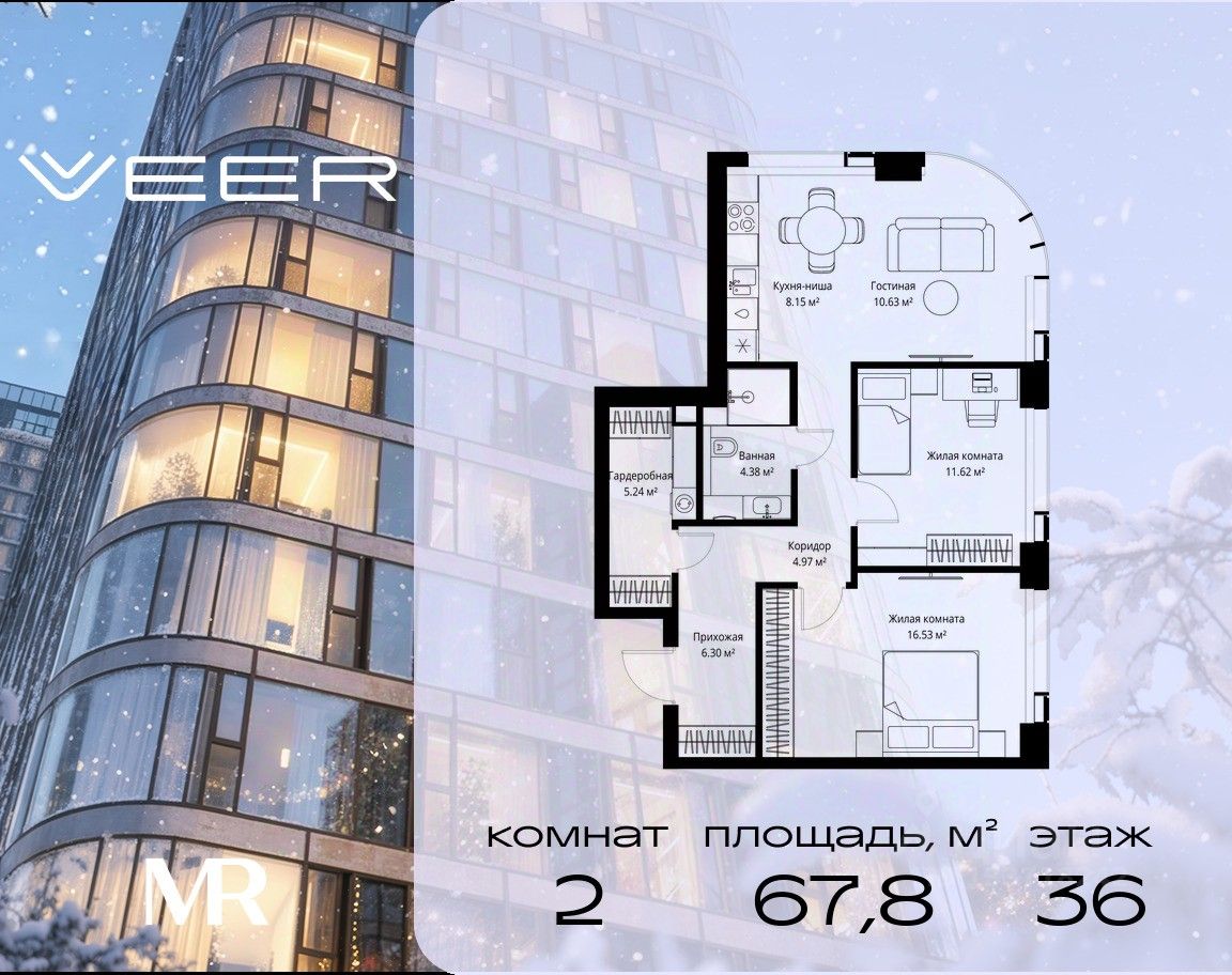 Продаётся 2-комнатная квартира общей площадью 67.82 м² без отделки в ЖК VEER на 36-м этаже 38 этажного дома.