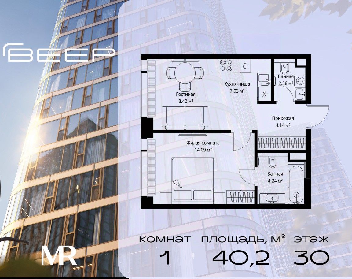 Продаётся 1-комнатная квартира общей площадью 40.18 м² без отделки в ЖК Веер на 30-м этаже 38 этажного дома.