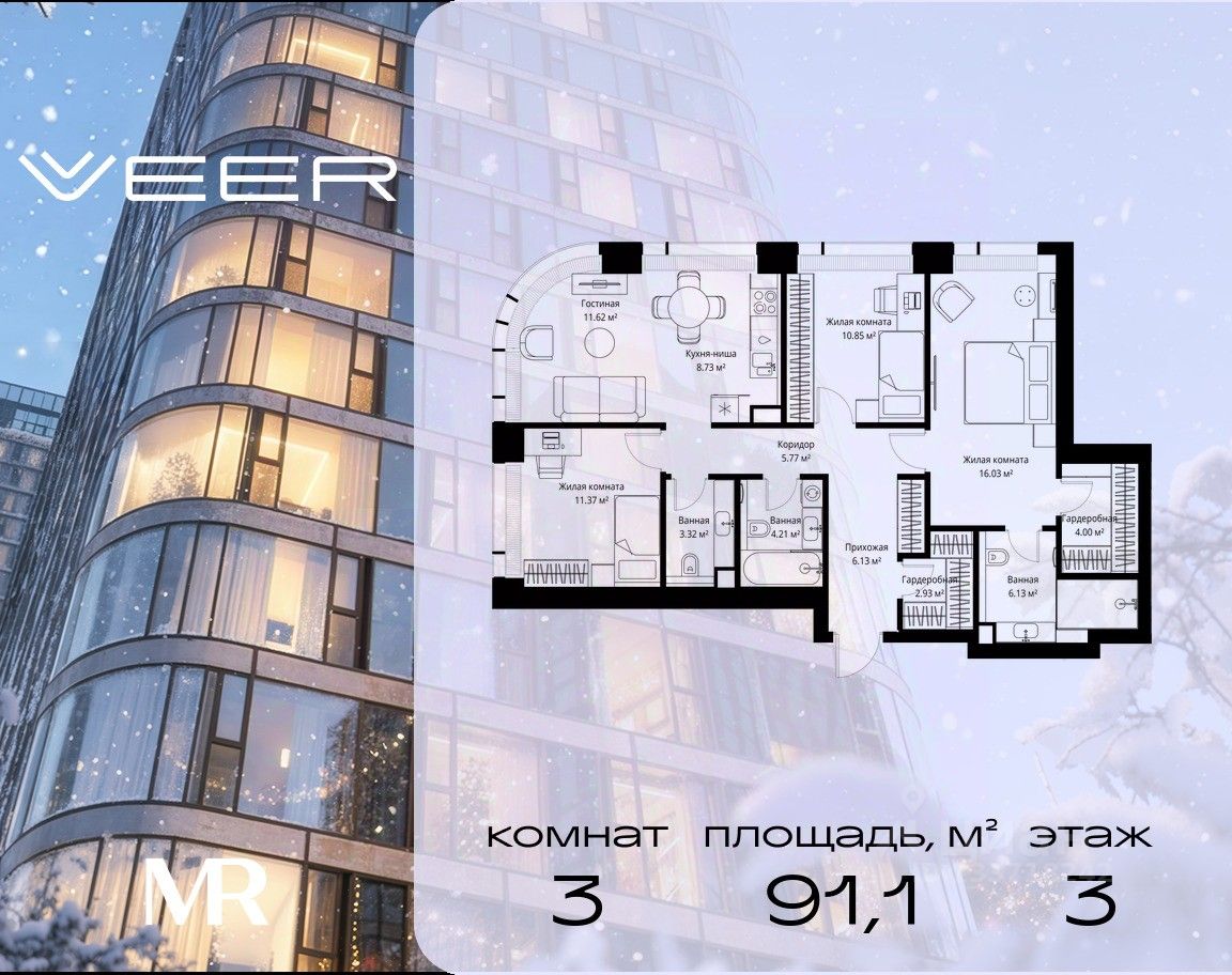 Продаётся 3-комнатная квартира общей площадью 91.09 м² без отделки в ЖК VEER на 3-м этаже 38 этажного дома.