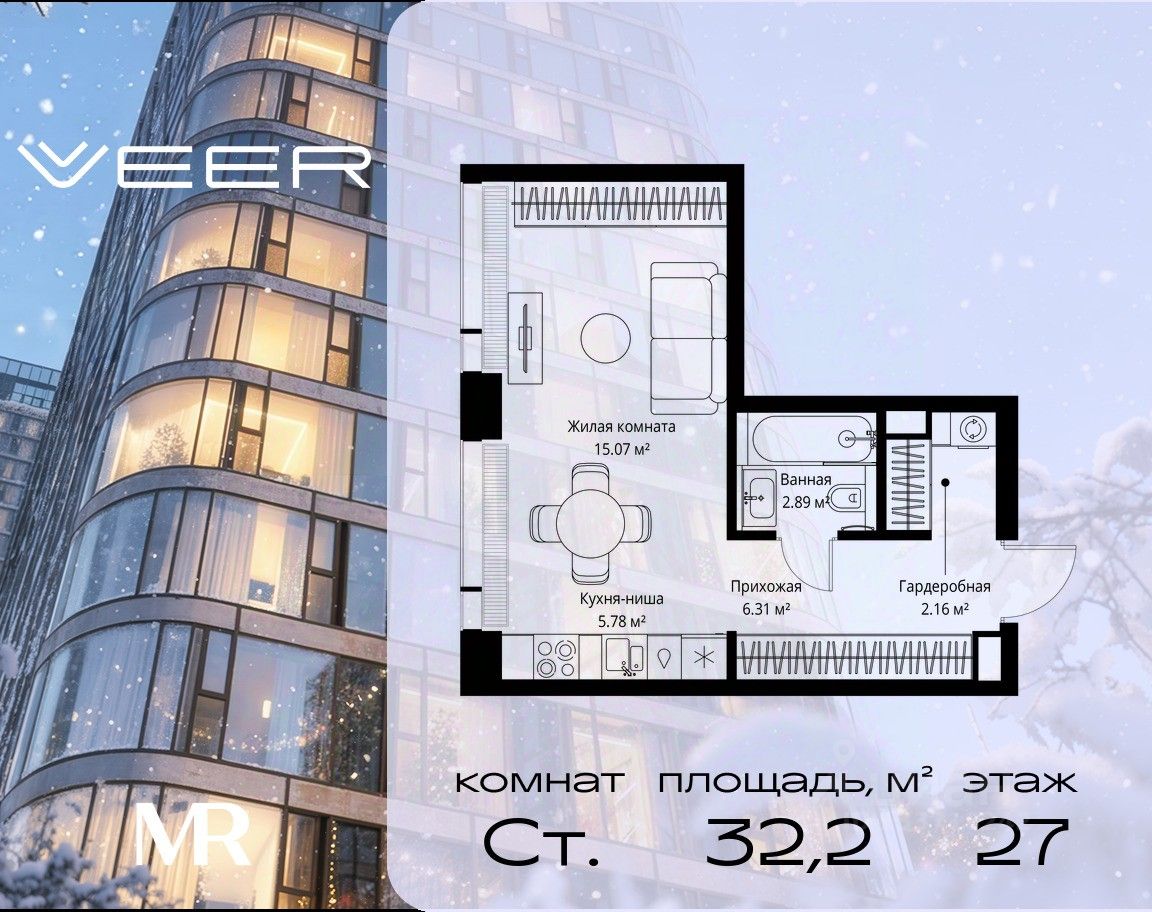 Продаётся студия общей площадью 32.21 м² без отделки в ЖК VEER на 27-м этаже 38 этажного дома.