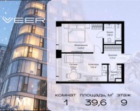 Продаётся 1-комнатная квартира общей площадью 39.63 м² без отделки в ЖК VEER на 9-м этаже 38 этажного дома.