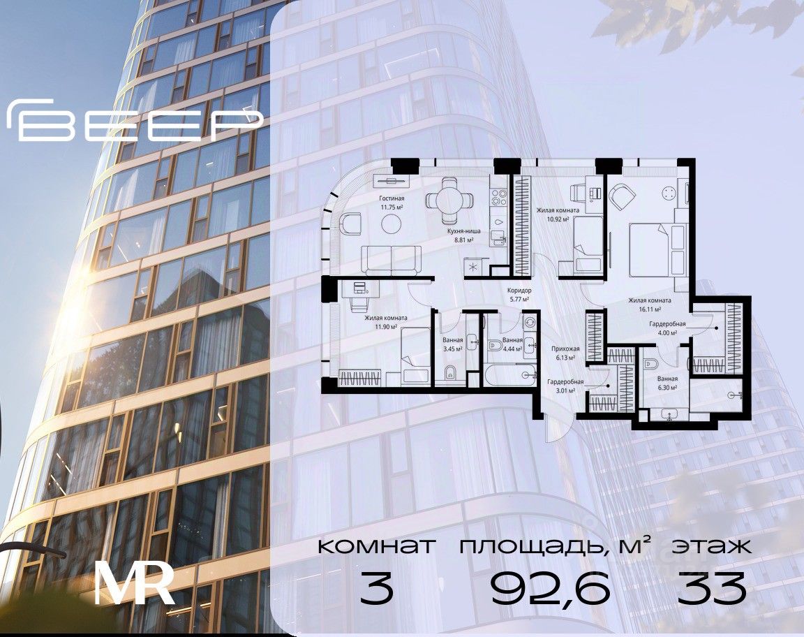 Продаётся 3-комнатная квартира общей площадью 92.59 м² без отделки в ЖК Веер на 33-м этаже 38 этажного дома.
