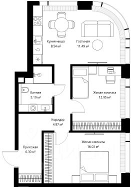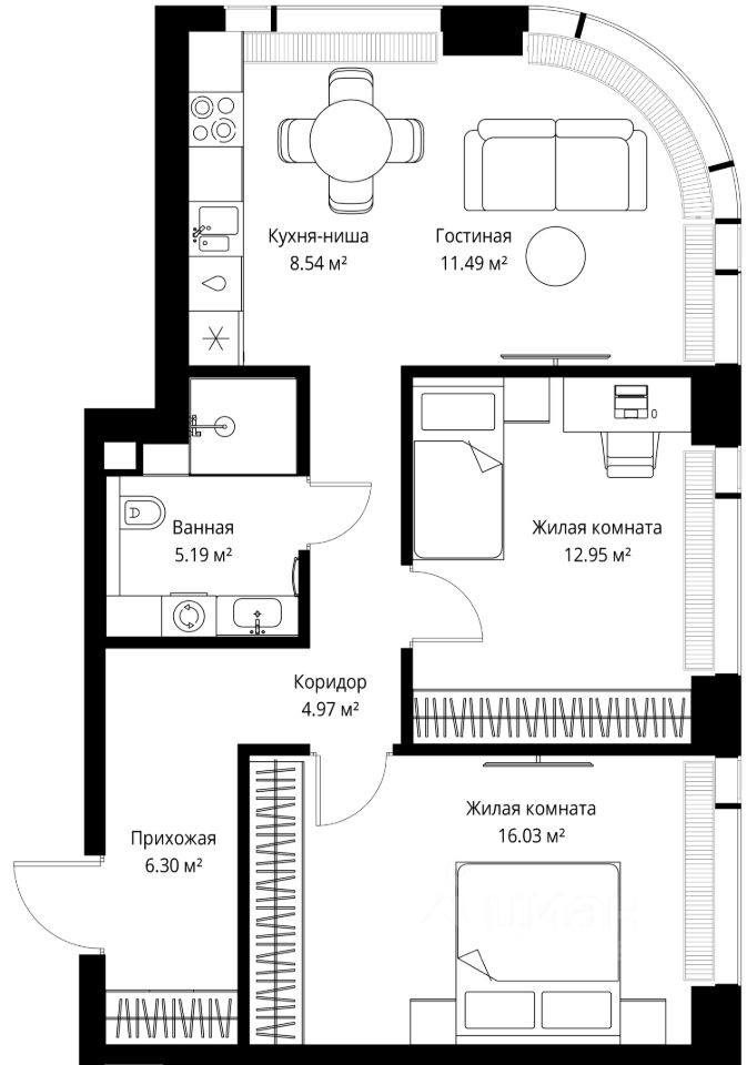 Продаётся 2-комнатная квартира общей площадью 65.47 м² без отделки в ЖК Веер на 27-м этаже 38 этажного дома.