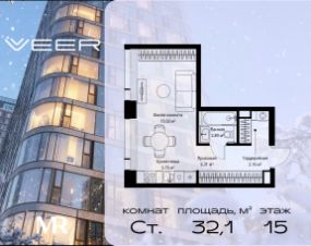 Продаётся студия общей площадью 32.14 м² без отделки в ЖК VEER на 15-м этаже 38 этажного дома.