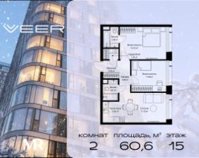 Продаётся 2-комнатная квартира общей площадью 60.63 м² без отделки в ЖК VEER на 15-м этаже 38 этажного дома.