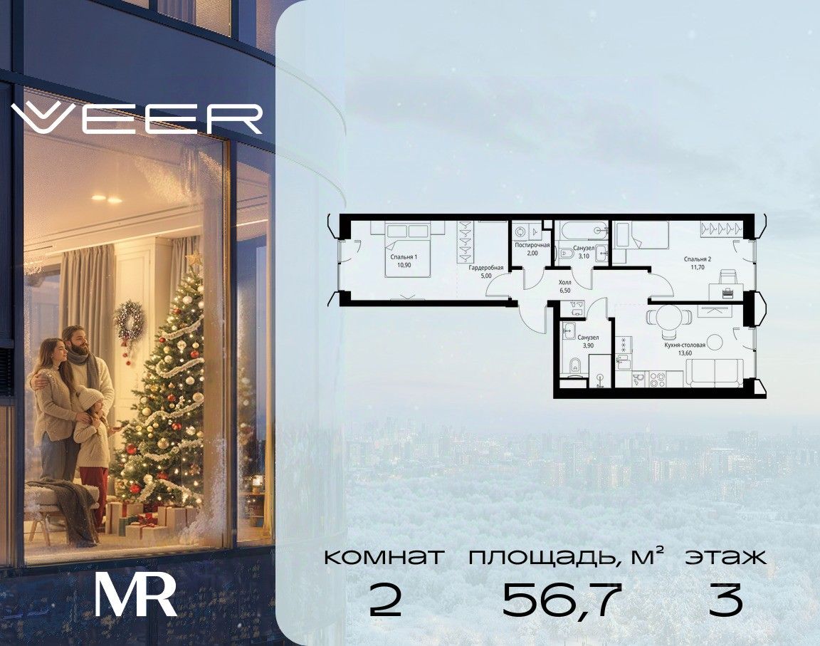 Продаётся 2-комнатная квартира общей площадью 56.70 м² с предчистовой отделкой в ЖК VEER на 3-м этаже 22 этажного дома.
