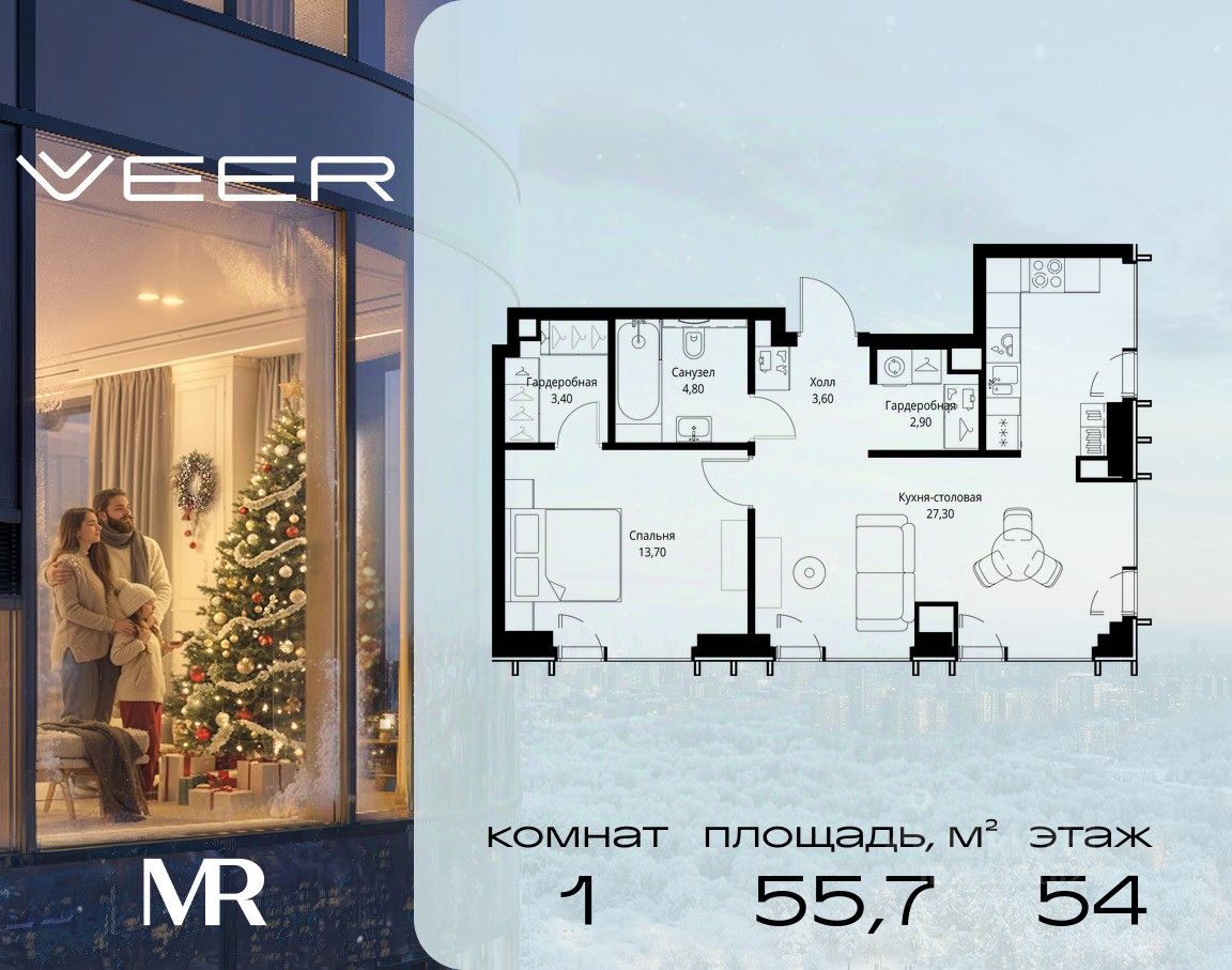 Продаётся 1-комнатная квартира общей площадью 55.70 м² с предчистовой отделкой в ЖК VEER на 54-м этаже 59 этажного дома.